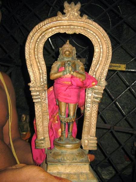 According to some legends Sri Vyasaraja used to pray to Lord Hanuman in this place by drawing an image of Lord Hanuman on the rocks. By the time he finished his prayers, the picture would have disappeared. When this happened for 12 days in a row, he pleaded with Lord Hanuman to appear before him. When the Lord appeared, he asked Sri Vyasaraja to constrain him in a six-sided amulet and build a temple in the area.